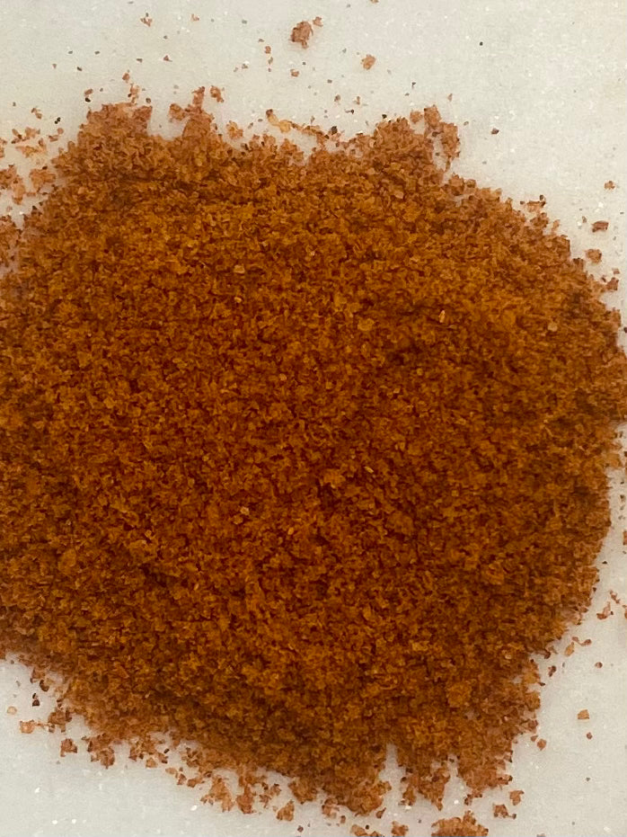 This is a mix of scorpion chili, red chili, citrus juice and powder and other ingredients to create a dry zesty and spicy seasoning blend. The flavor is citrus and spicy forward with subtle savory earthiness.